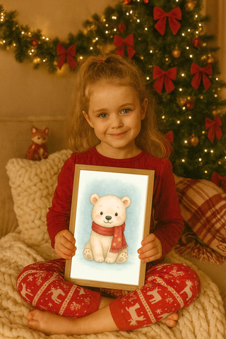 Meet the sweetest little polar bear, all bundled up in his soft white scarf and ready to bring winter magic to your home. This charming watercolor illustration captures a gentle, cozy vibe—perfect for nurseries, kids’ rooms, or anyone who loves adorable winter animals.
